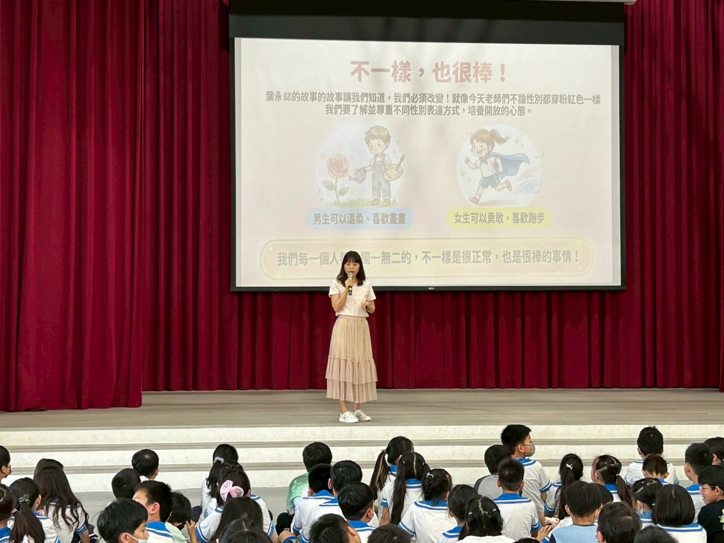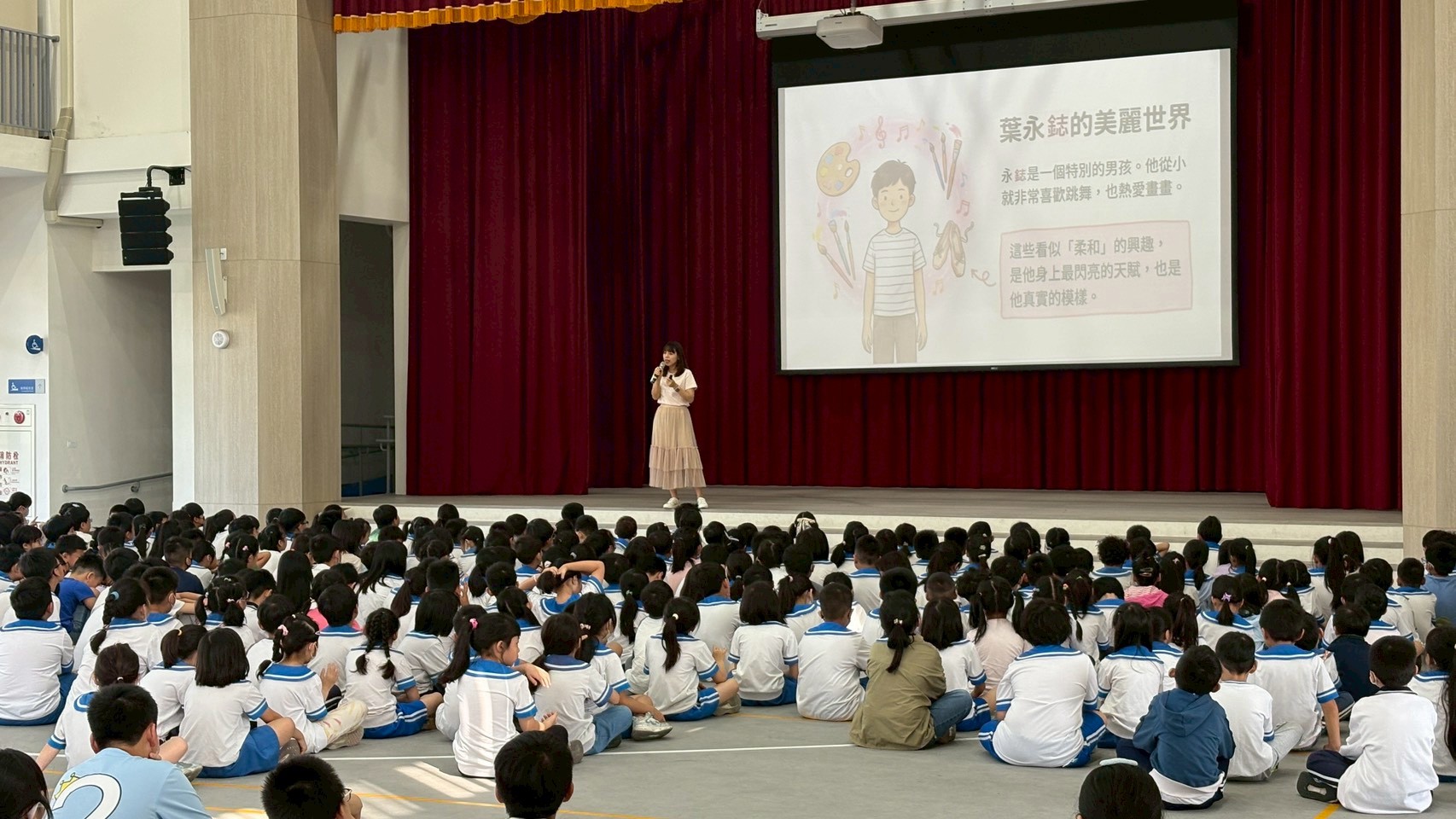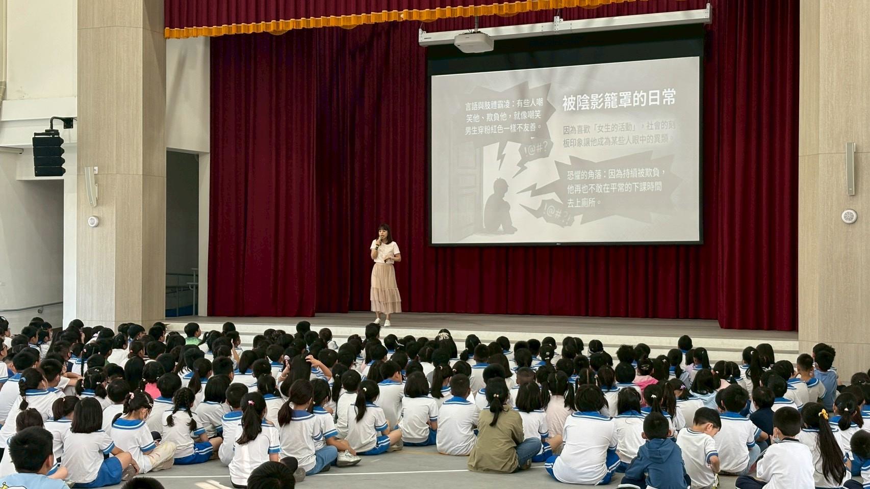 活動一開始,輔導室老師特別播放了歌手蔡依林的《玫瑰少年》,與孩子進行互動,並向全校師生娓娓道來葉永鋕的真實故事。透過充滿同理心的引導,孩子們了解到永鋕大哥哥當年因為喜歡跳舞與畫畫等特質,遭受刻板印象的嘲笑與校園霸凌,甚至不敢在下課時間去上廁所,最終釀成無法挽回的遺憾。藉由這個故事,帶領孩子們深刻反思,學習打破性別框架。