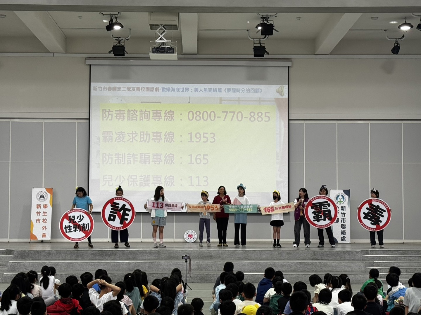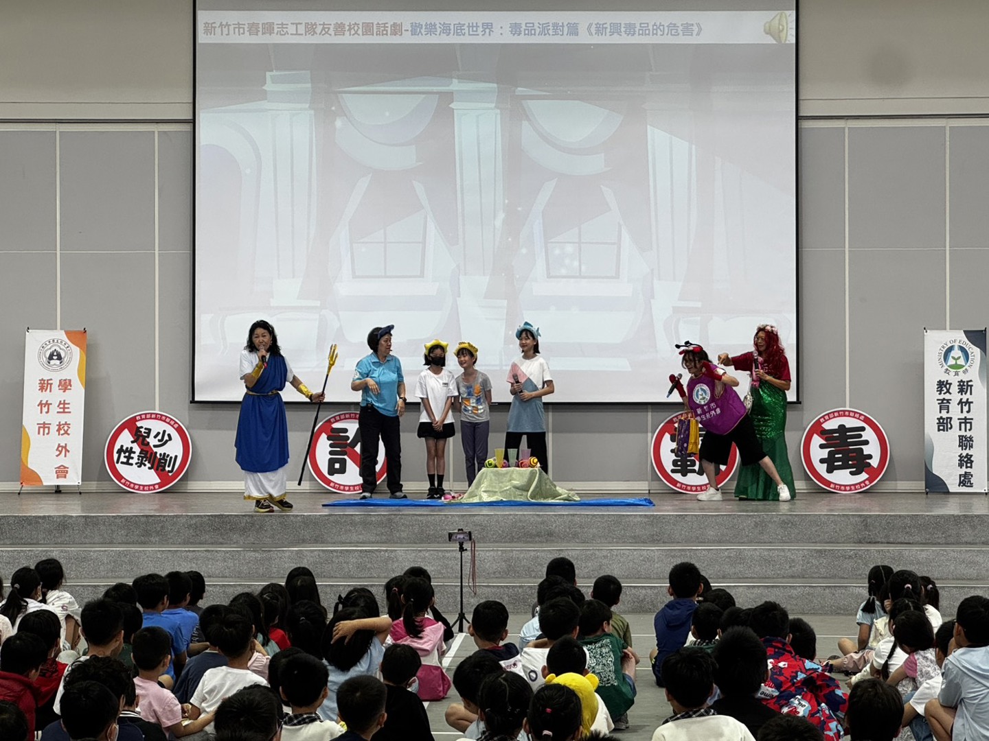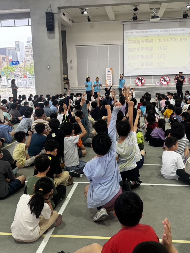 本校邀請新竹市校外會-春暉志工隊至本校進行:防制學生藥物濫用-多元宣導活動,利用話劇「歡樂海底世界」演出向全校師生進行反毒、反詐騙、