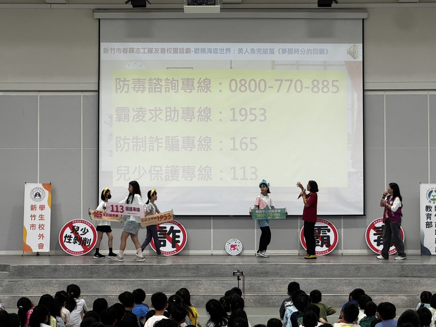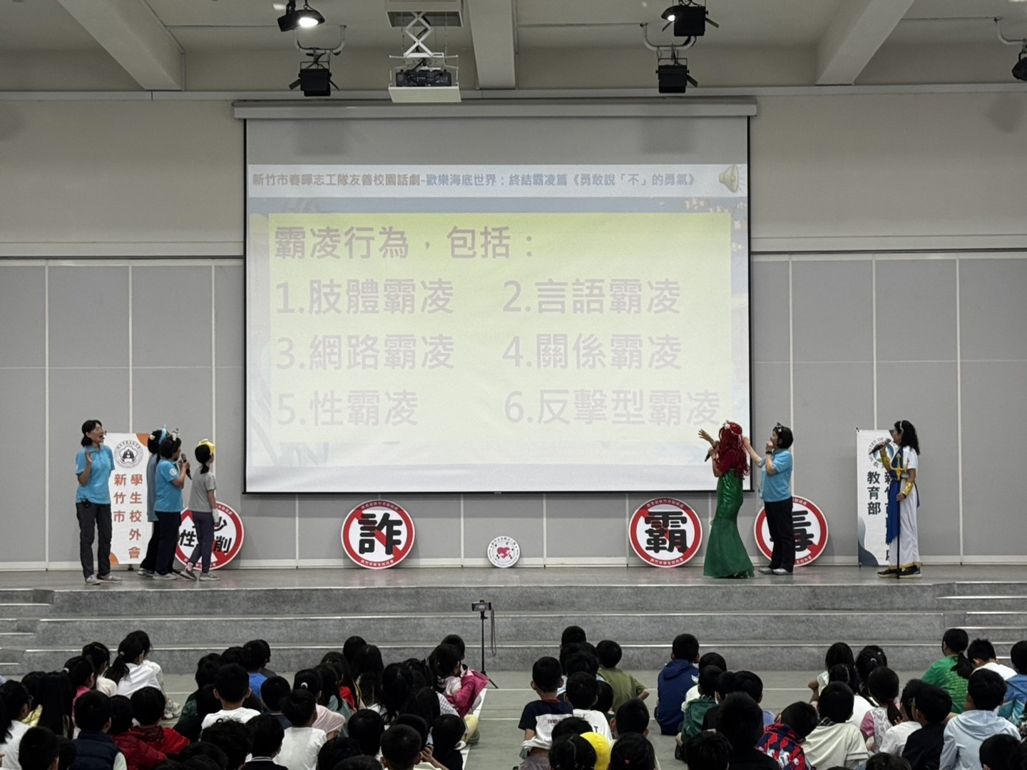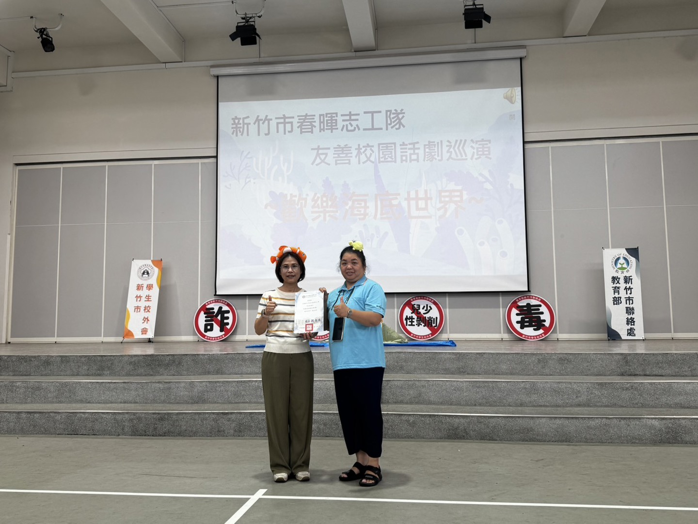 本校邀請新竹市校外會-春暉志工隊至本校進行:防制學生藥物濫用-多元宣導活動,利用話劇「歡樂海底世界」演出向全校師生進行反毒、反詐騙、