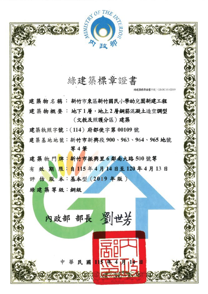 新竹國小新建幼兒園工程取得綠建築標章,展現節能環保理念,打造健康舒適學習環境,邁向永續發展新里程碑。