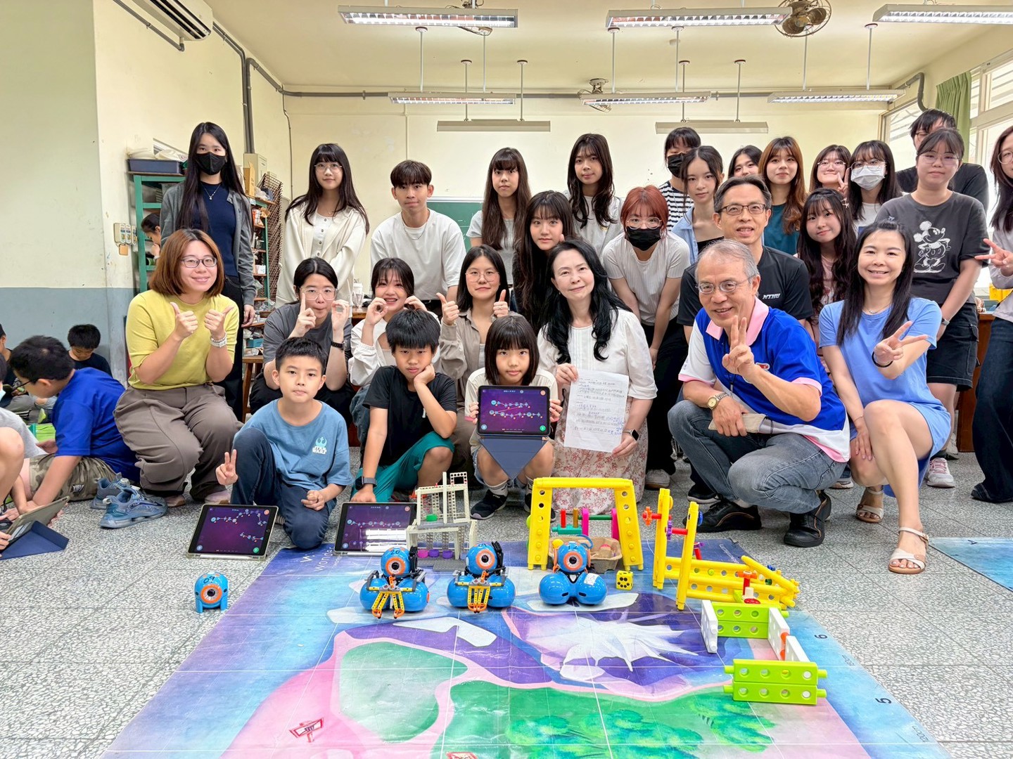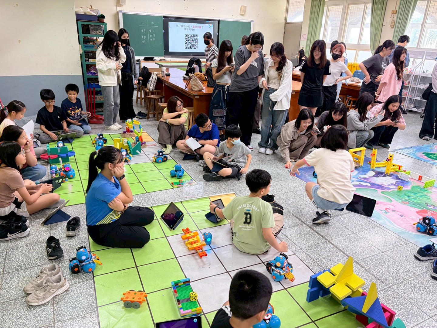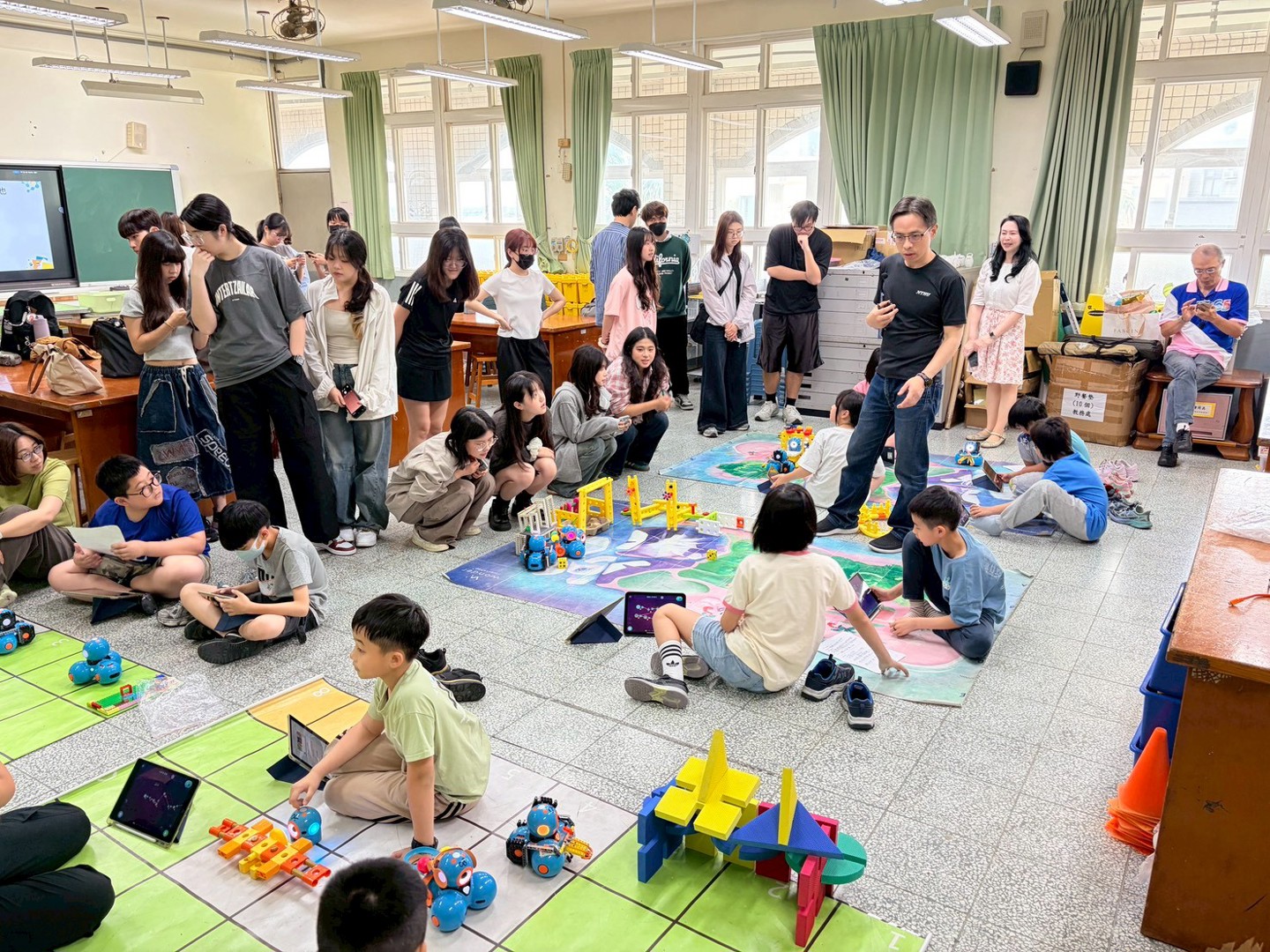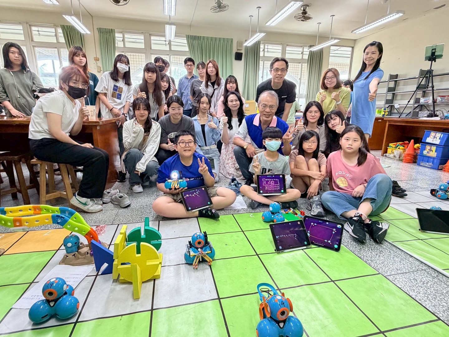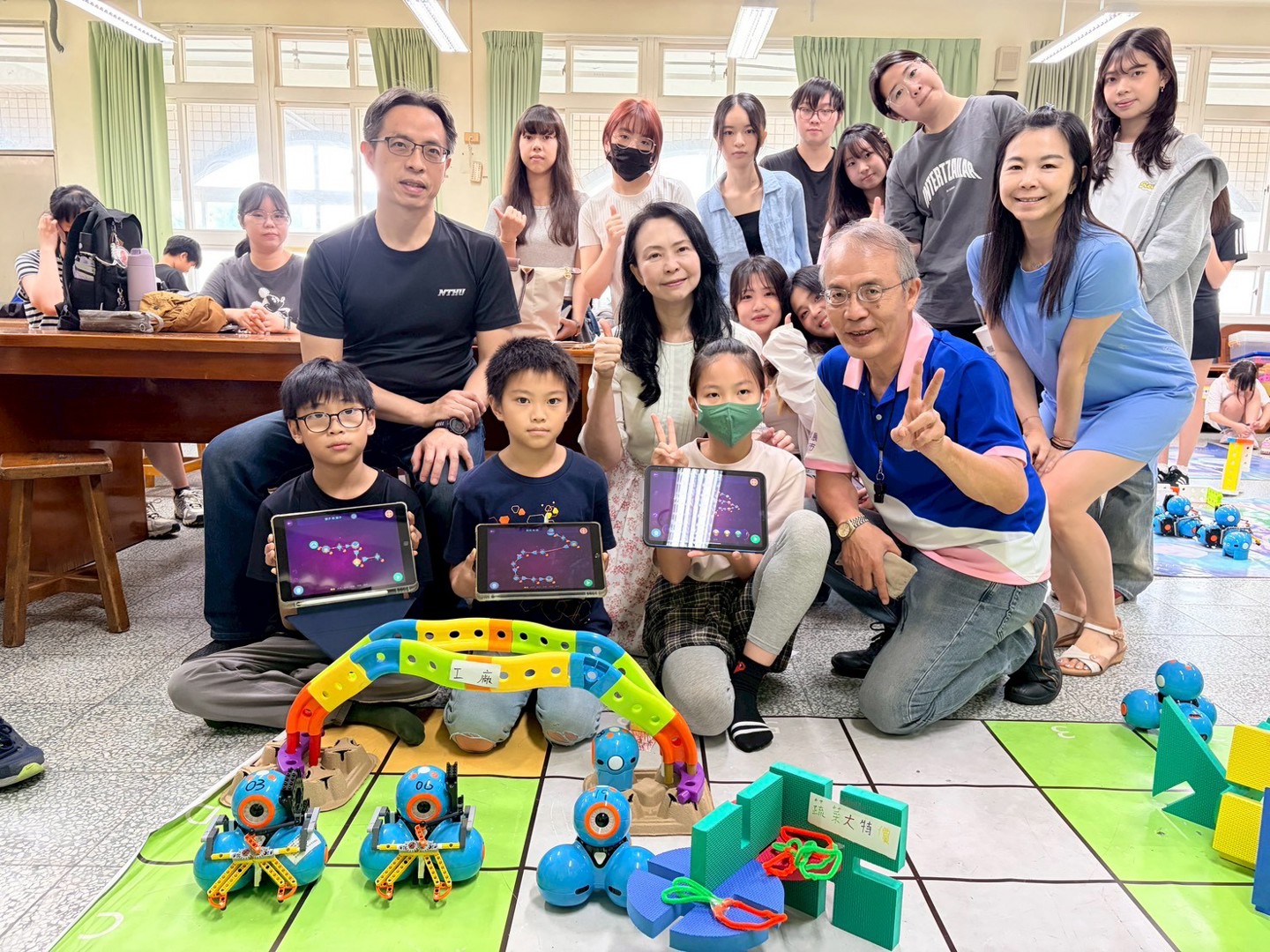 本次參訪的重點為四年級學生的專題成果展。學童們化身為「小小永續推廣大使」,自信地向大學生們解說專題內容。在實作展示中,學生們運用iPad編寫程式,操作校內的25台Dash機器人來完成專題任務。為了支持課程發展,學校在學習配套上也用心規劃,提供44組樂高積木、多組智高積木與創作底板,讓學生在搭建場景與設計機器人角色時能發揮創意,並提升美感素養;此外,學生們也大量運用紙箱、氣泡袋、塑膠杯蓋與瓶蓋等環保回收物進行多媒材創作,將環保理念落實於作品之中。