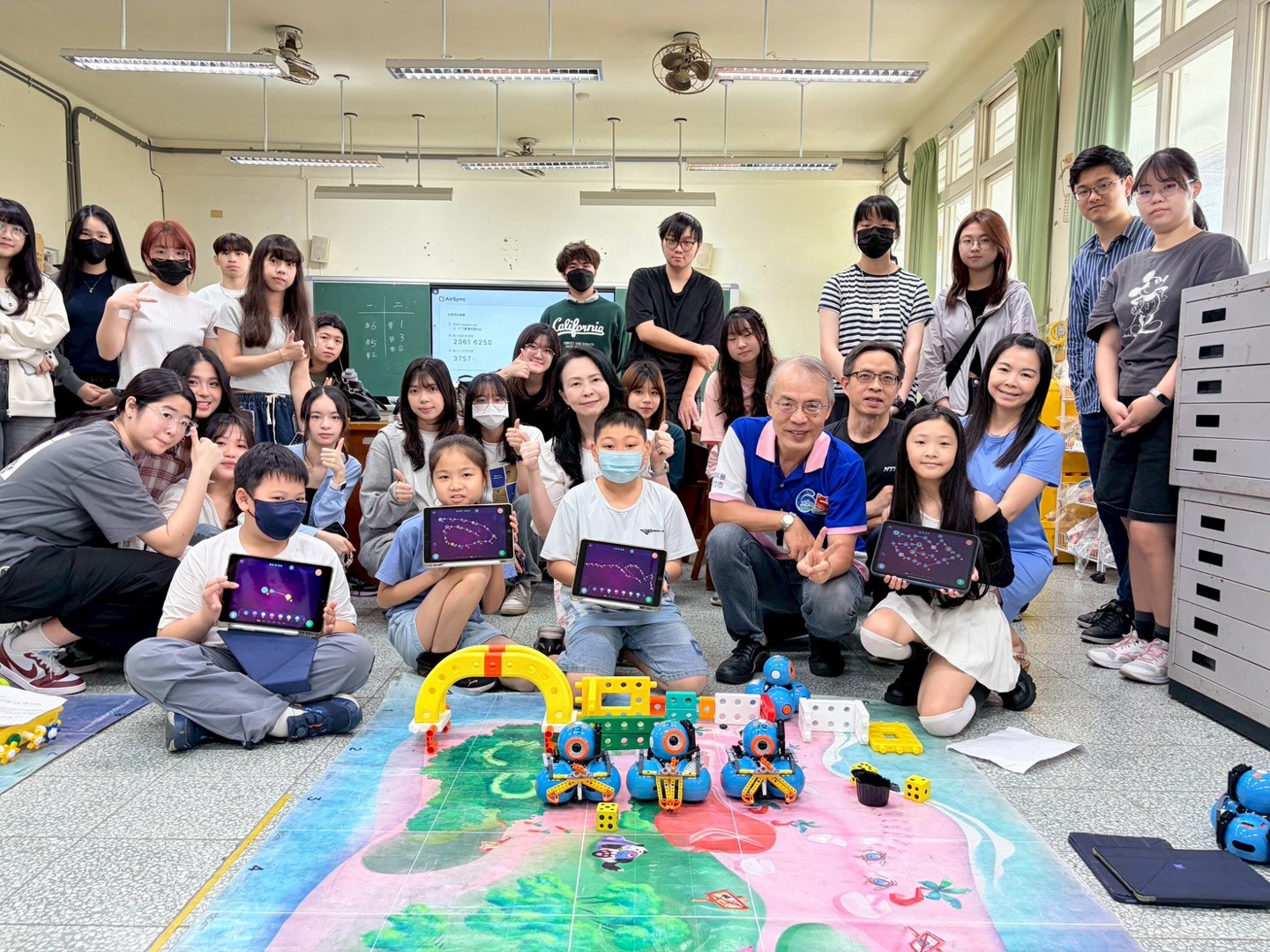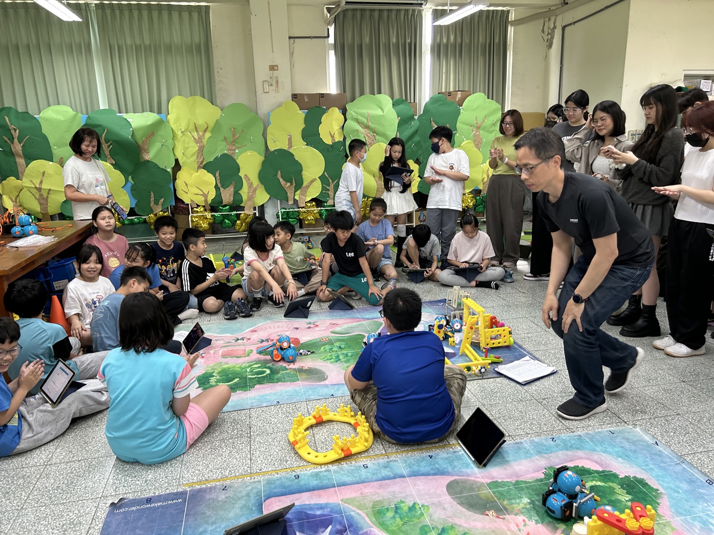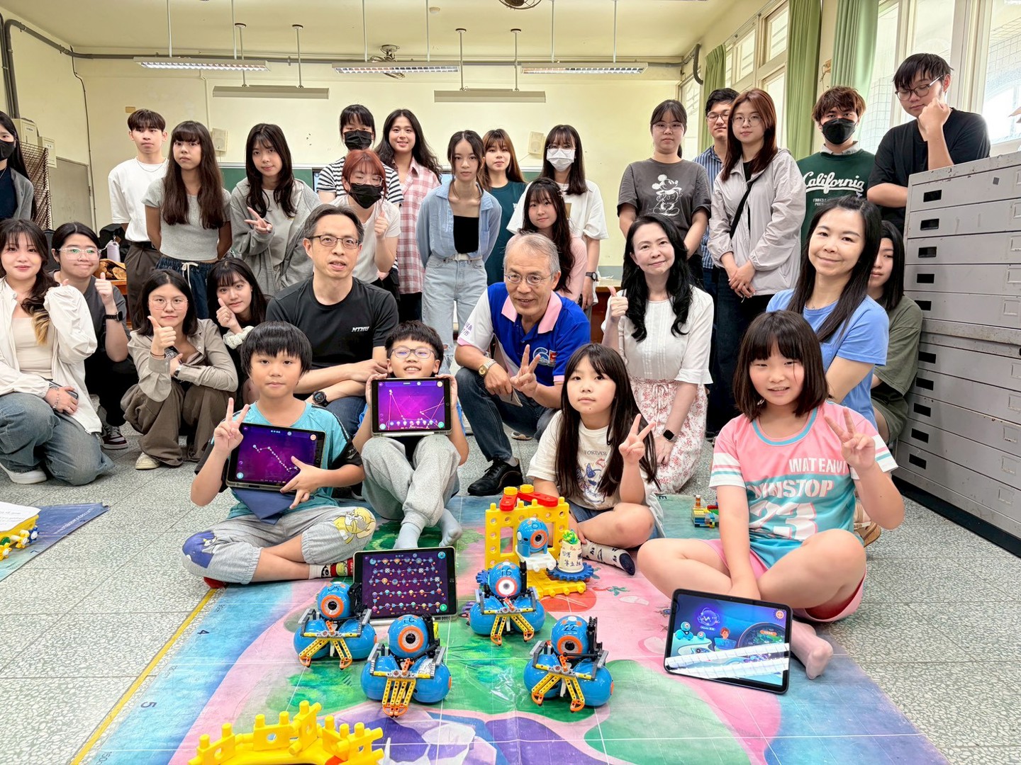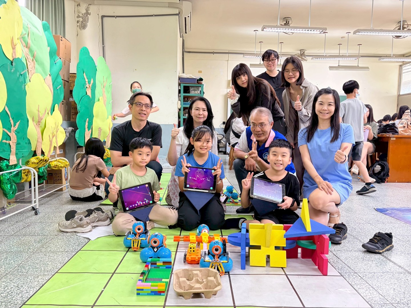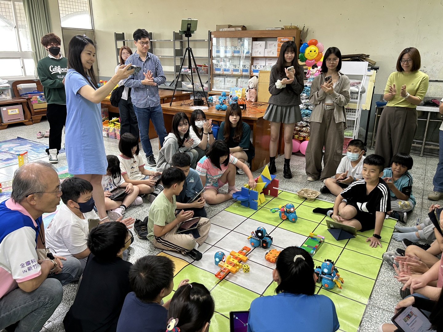 本次參訪的重點為四年級學生的專題成果展。學童們化身為「小小永續推廣大使」,自信地向大學生們解說專題內容。在實作展示中,學生們運用iPad編寫程式,操作校內的25台Dash機器人來完成專題任務。為了支持課程發展,學校在學習配套上也用心規劃,提供44組樂高積木、多組智高積木與創作底板,讓學生在搭建場景與設計機器人角色時能發揮創意,並提升美感素養;此外,學生們也大量運用紙箱、氣泡袋、塑膠杯蓋與瓶蓋等環保回收物進行多媒材創作,將環保理念落實於作品之中。