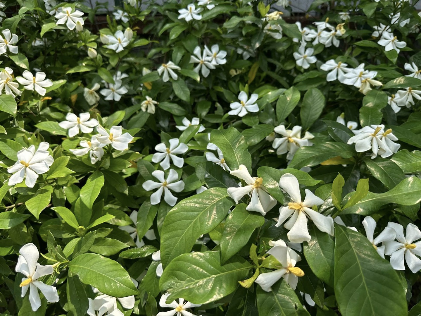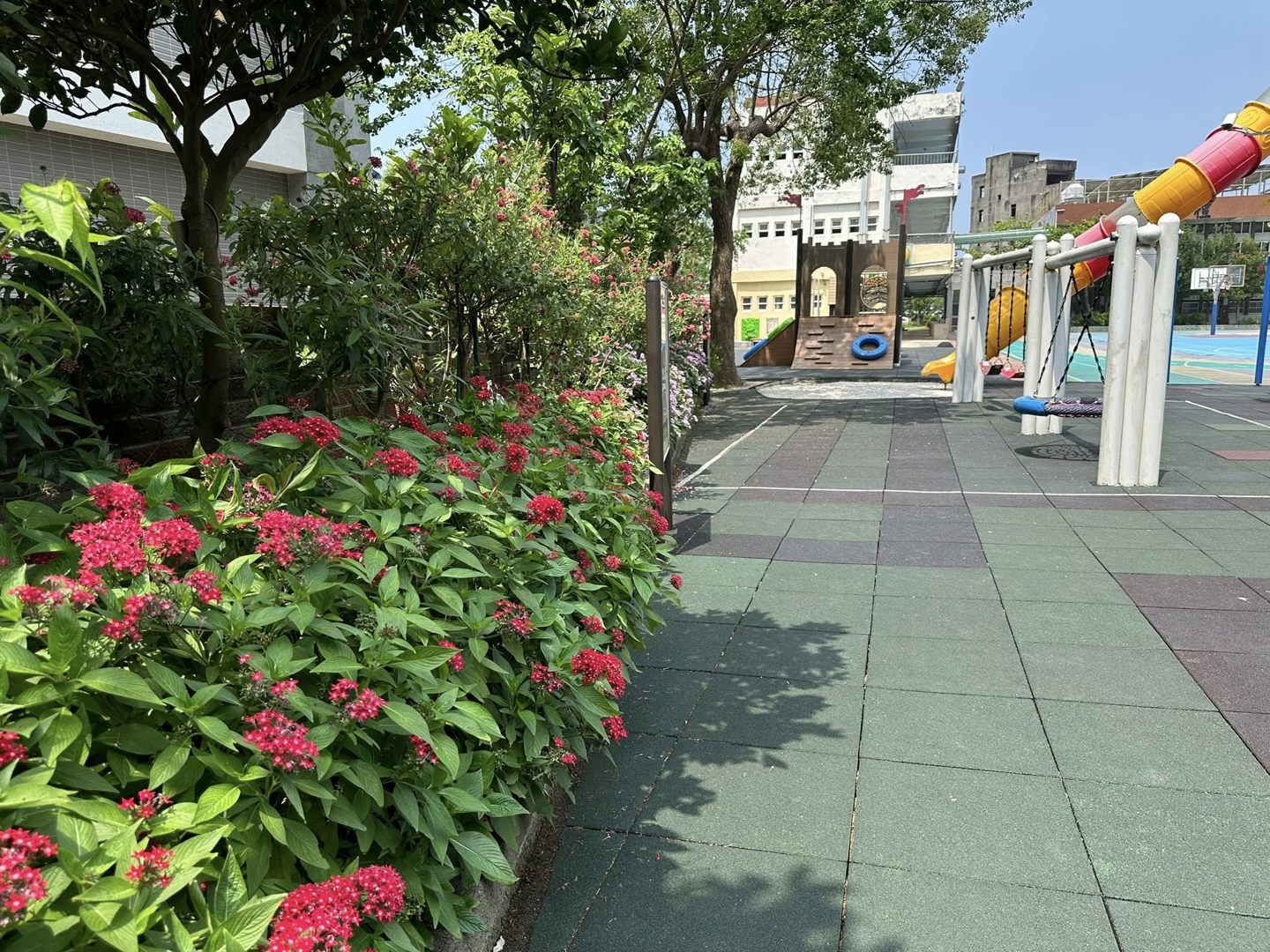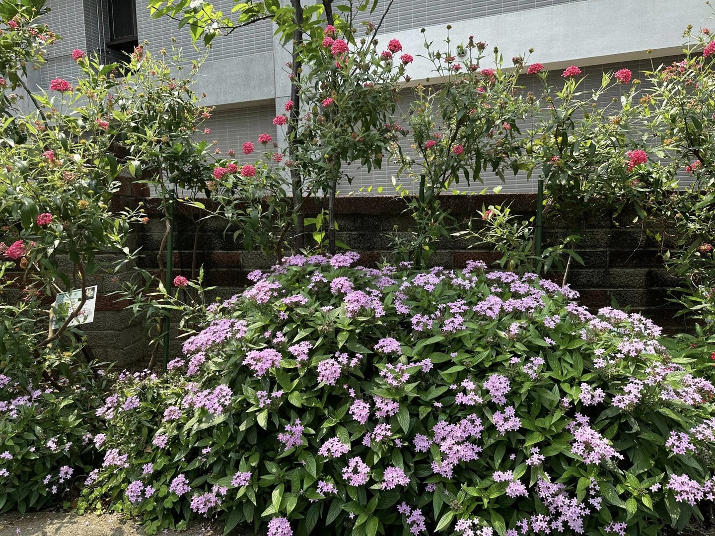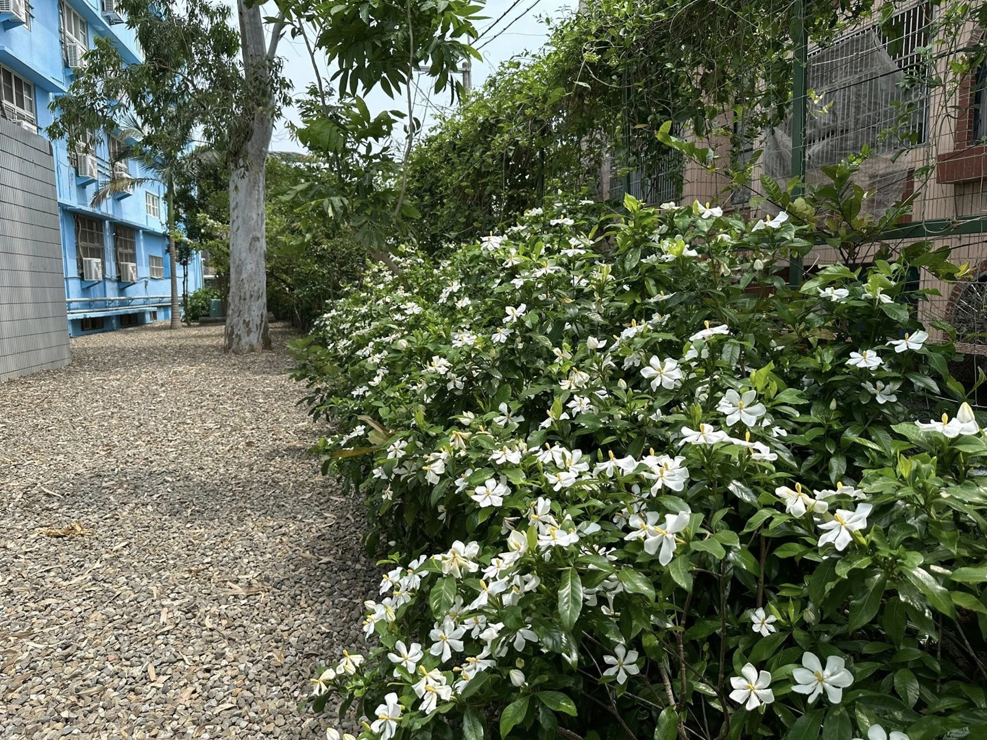 繁星花長年盛開。在這個季節,又是山黃梔盛開的時候,綠籬計畫區滿園清香!學校有個後花園,可以教學可以散步,真好!