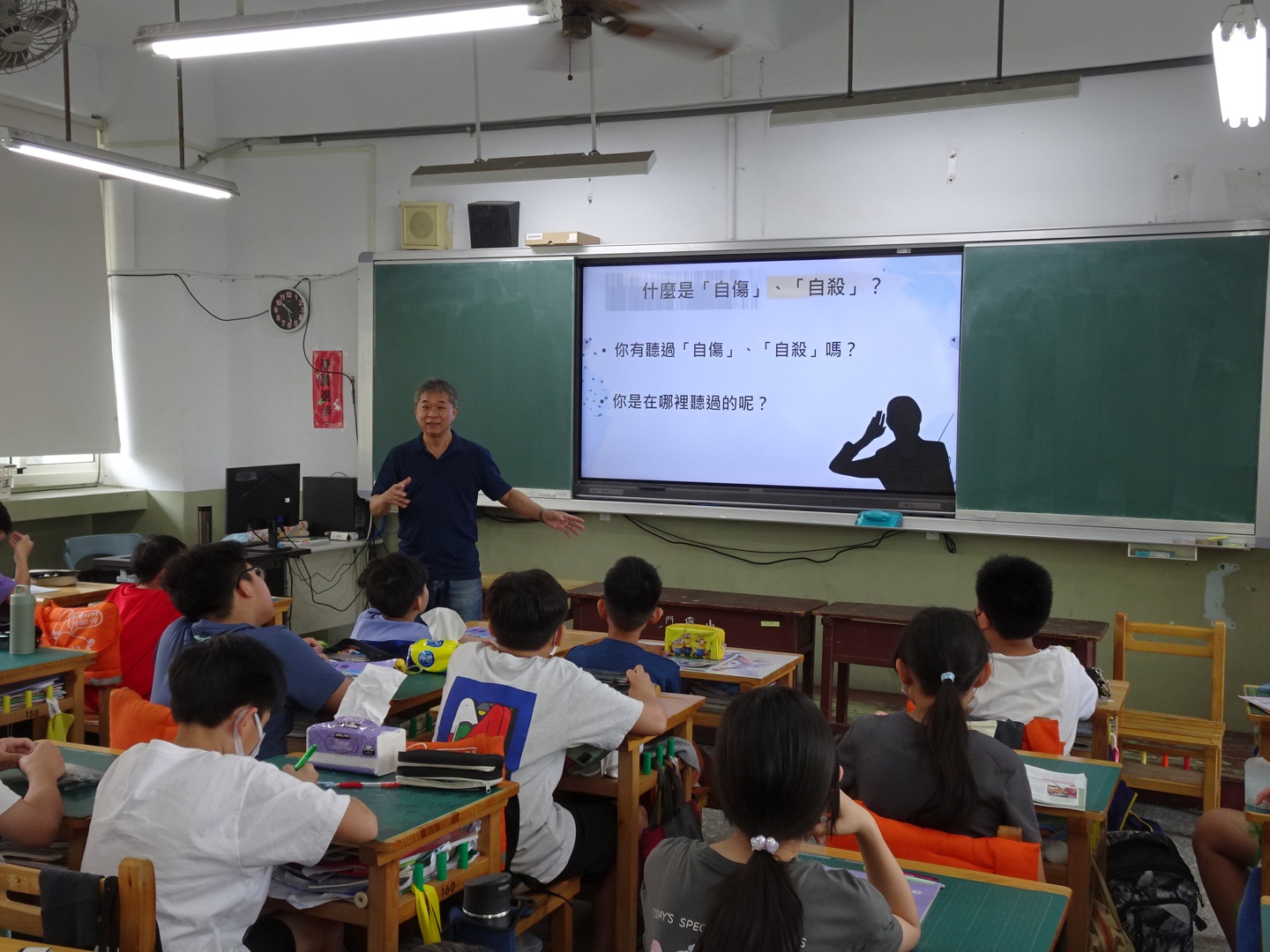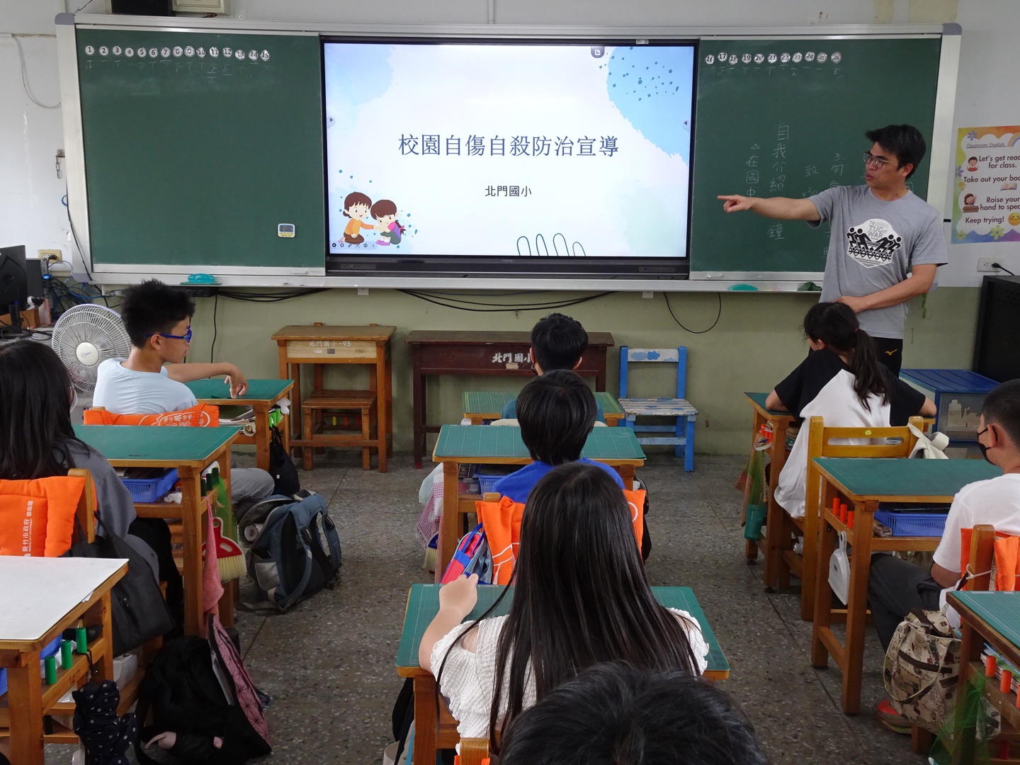 北門國小於 115 年 4 月 23 日為四年級學生辦理了自殺與自傷防治入班宣導活動,本次活動由輔導處與學務處的主任、組長及專輔老師共同入班擔任主講。宣導團隊帶領學生一同探索小學階段常見的煩惱,例如人際關係的磨合、課業壓力的負荷以及家庭議題的挑戰,並向學生說明當孩子獨自面對這些困境時,可能會產生傷害身體的自傷行為,而這類行為正是內心發出的求救訊號,需要大家共同關注。