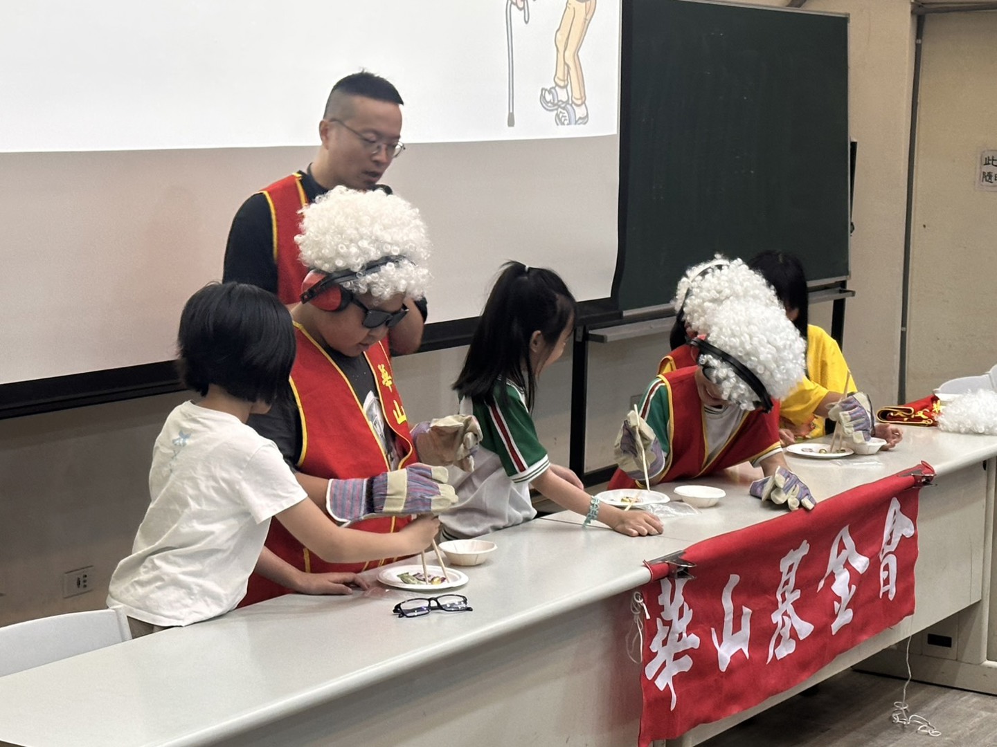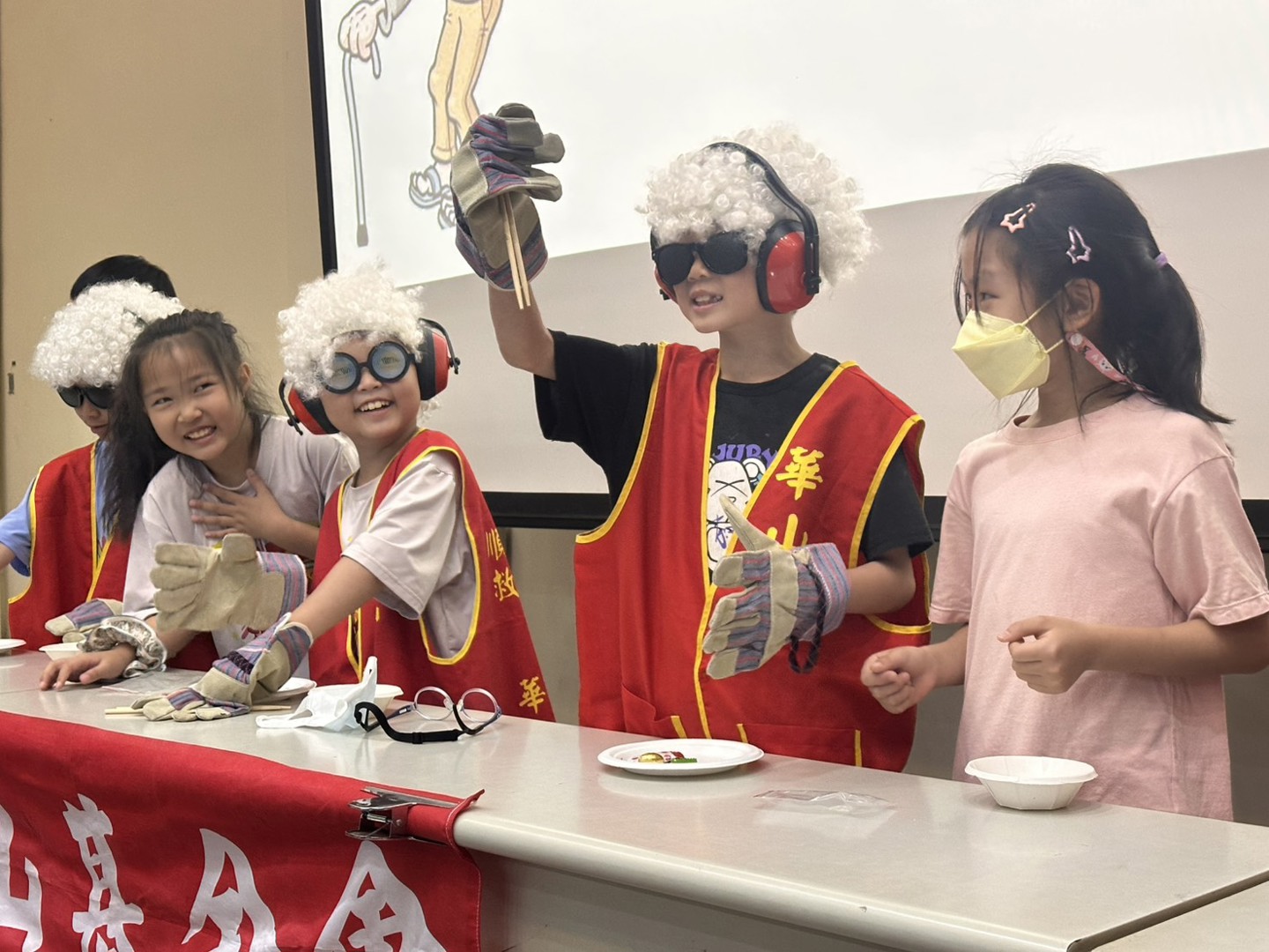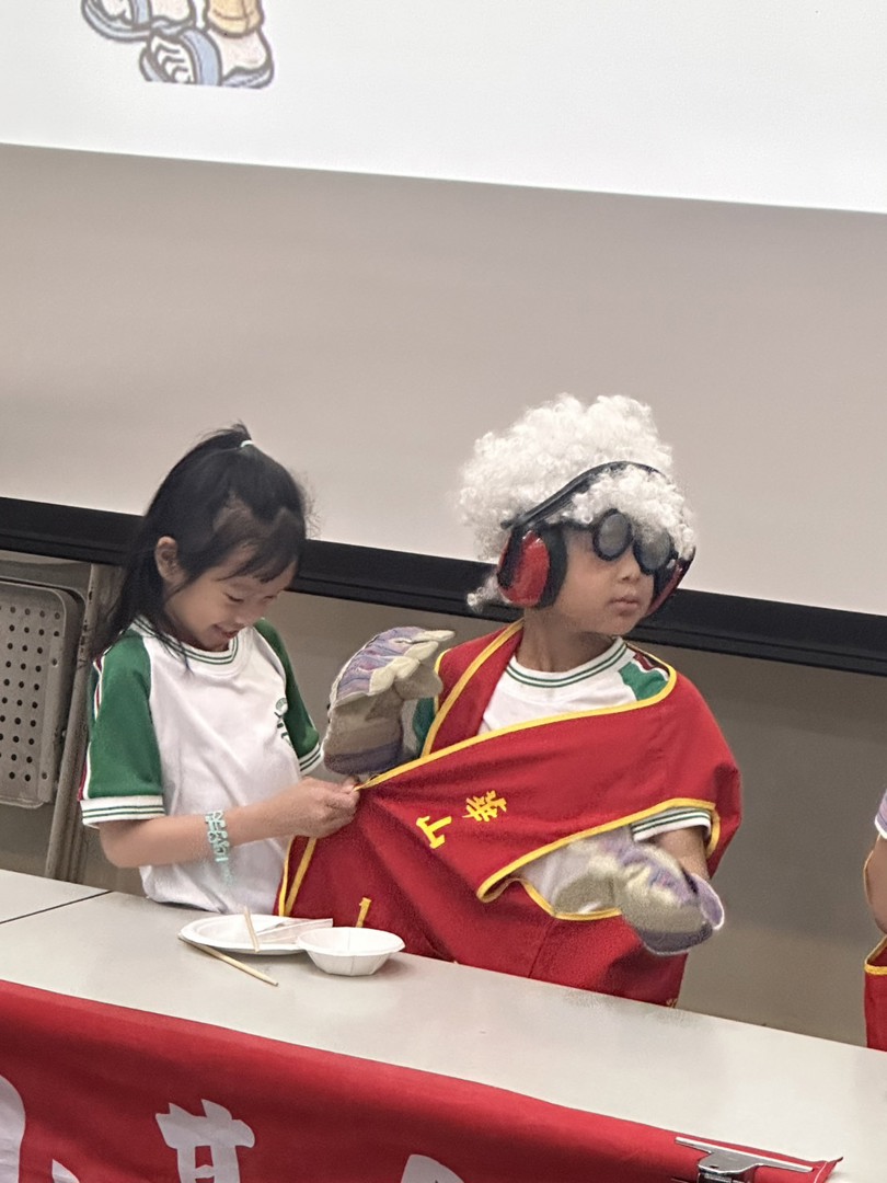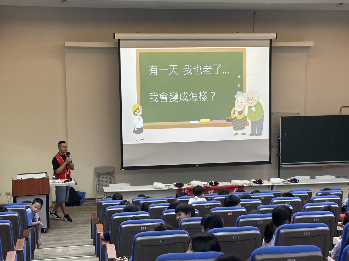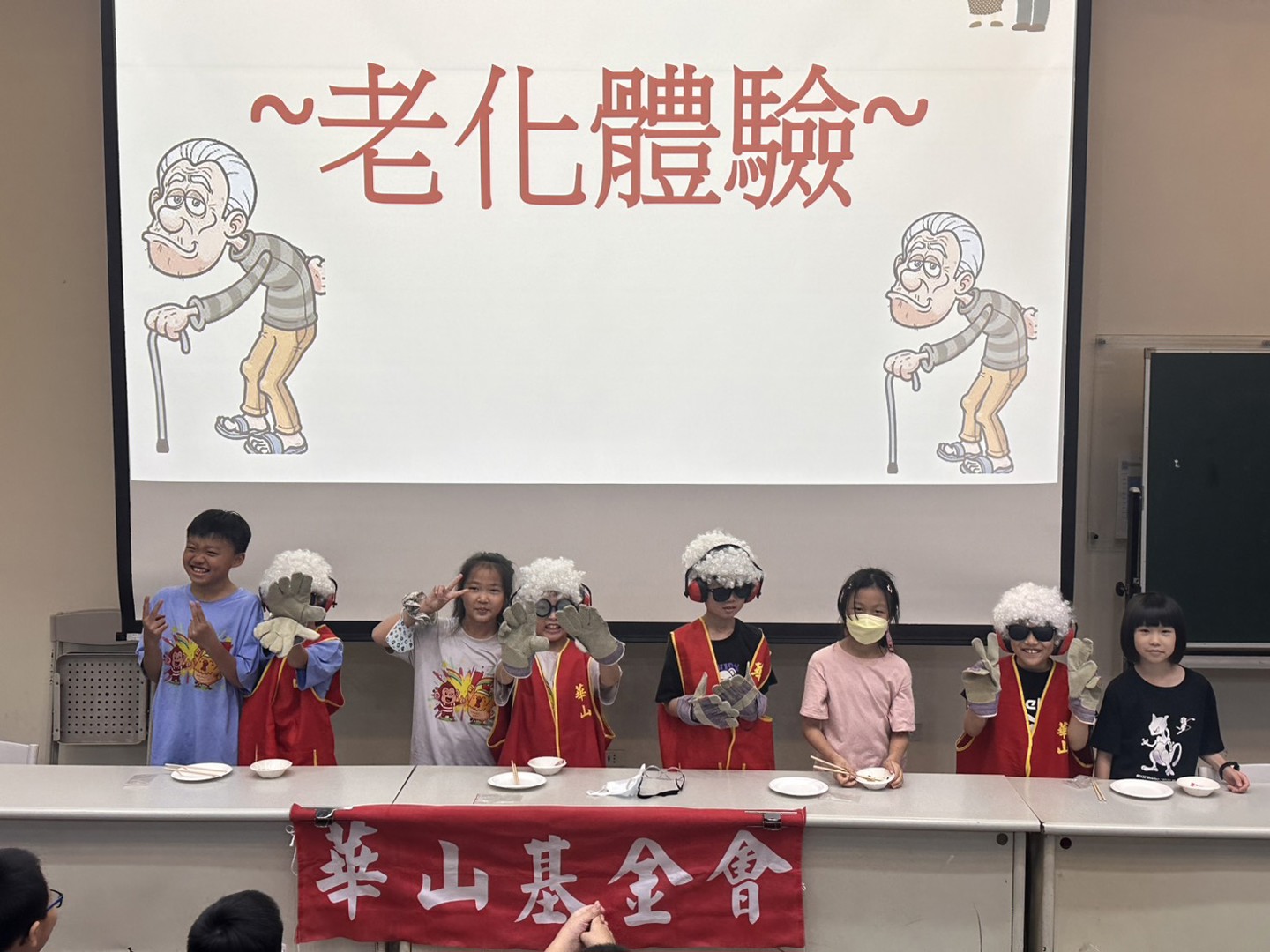 王站長除了讓學生們了解獨居長者的困難之處,更帶來各種模擬體驗老化的道具。例如白髮頭套、加重手套、耳罩及眼花眼鏡等,都讓孩子們有機會親身感受長者在日常生活中所面臨的各種不便。他們也分別扮演孫子及爺爺奶奶的角色,學習如何主動關懷及協助年長者的需求。