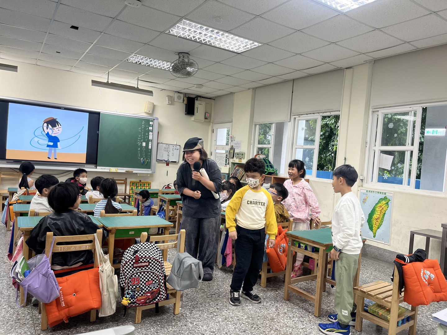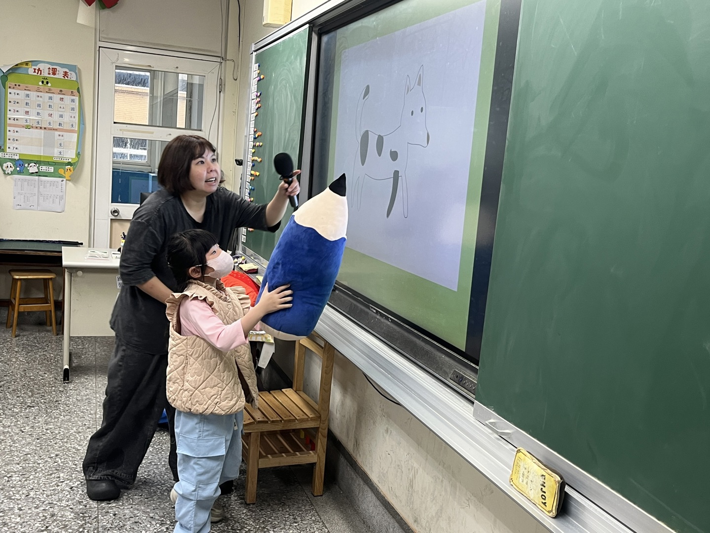在互動環節中,學童們表現極為踴躍,紛紛舉手爭取上台機會。有的孩子穿上象徵繪畫創作的圍裙,在螢幕前扮演小畫家,點綴出心目中可愛的狗狗模樣;也有孩子拿起巨大的鉛筆造型抱枕,在蛋頭姐姐的引導下,學習觀察狗狗的身體特徵。透過這些趣味感官體驗,原本冷冰冰的課本知識,轉化成了深刻的生命體悟。