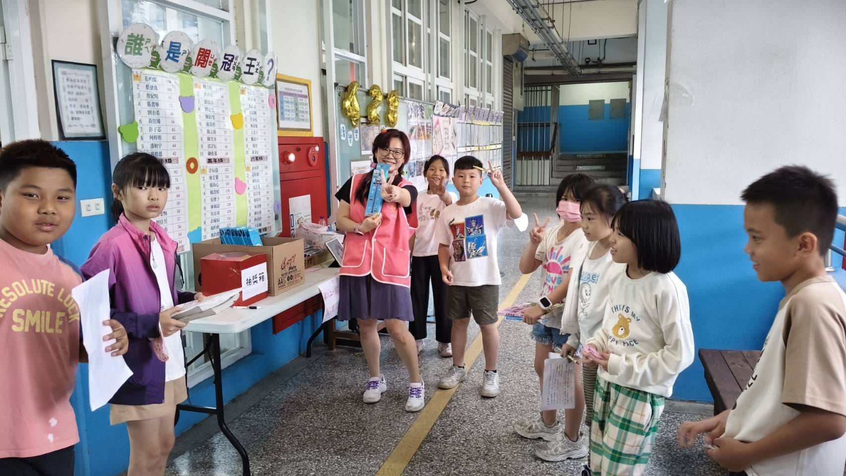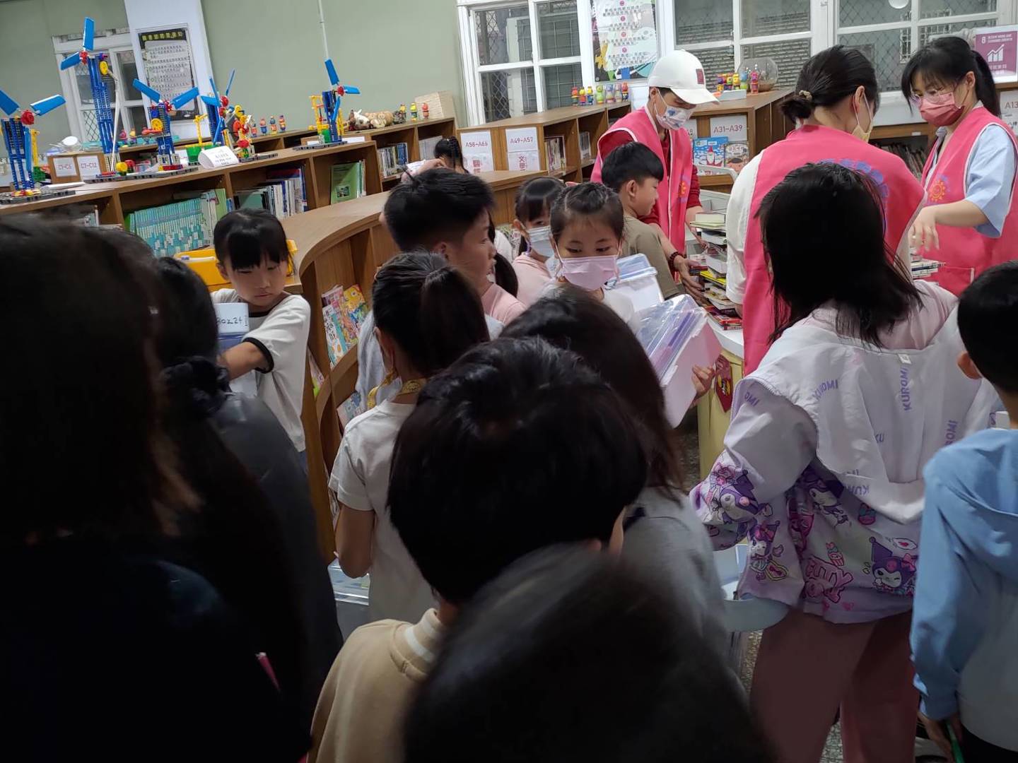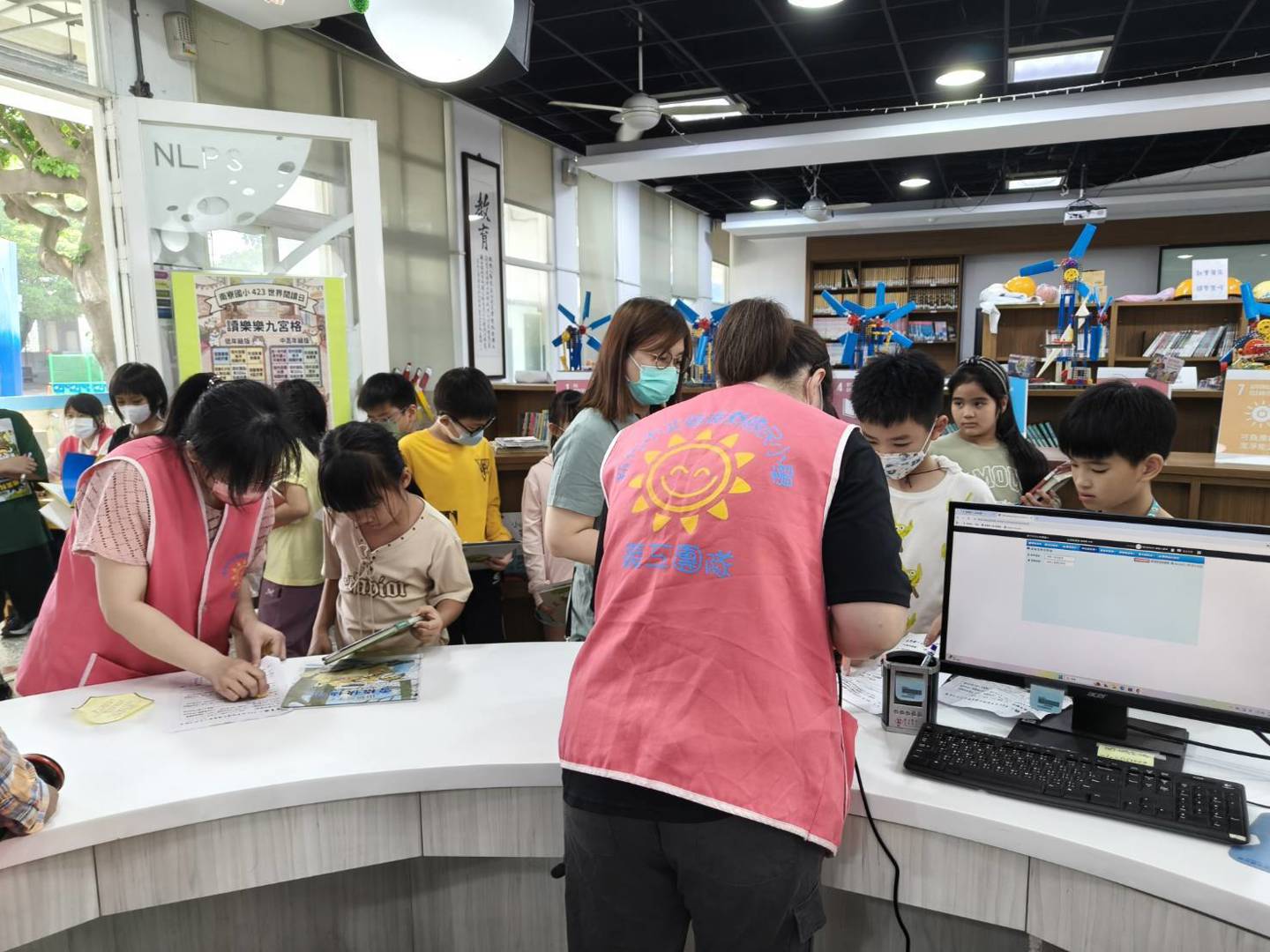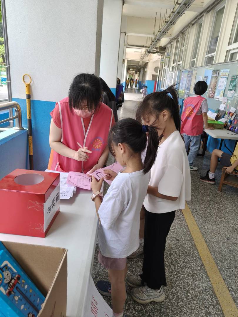 面對下課時間湧入圖書館的闖關人潮,志工阿姨們分工合作、有條不紊。在櫃台,她們耐心地為大排長龍的學生們刷借還書,並協助過關的小朋友辦理獎品兌換,讓每個完成九宮格任務的孩子都能帶著滿滿的成就感與禮物開心而歸。
