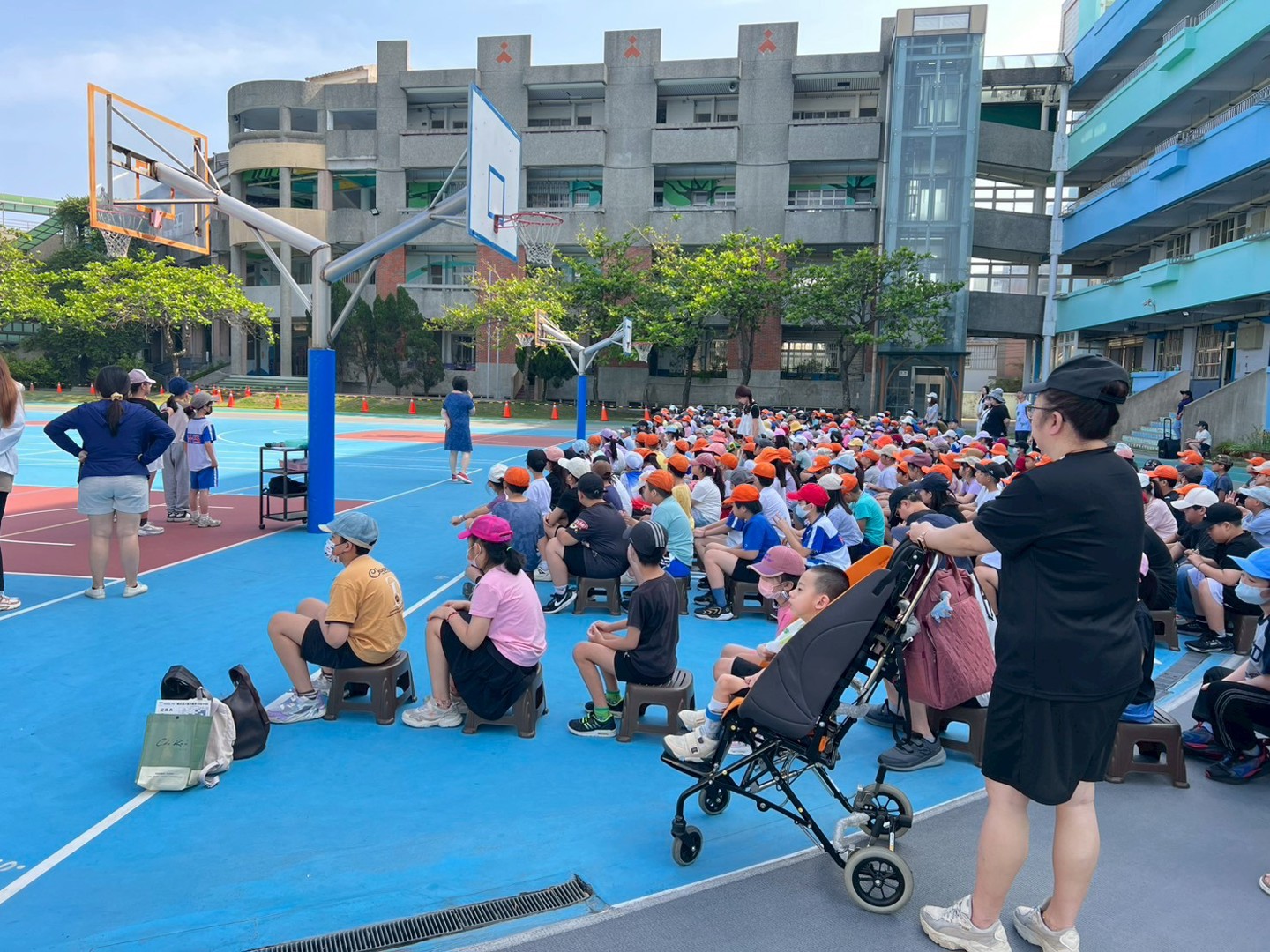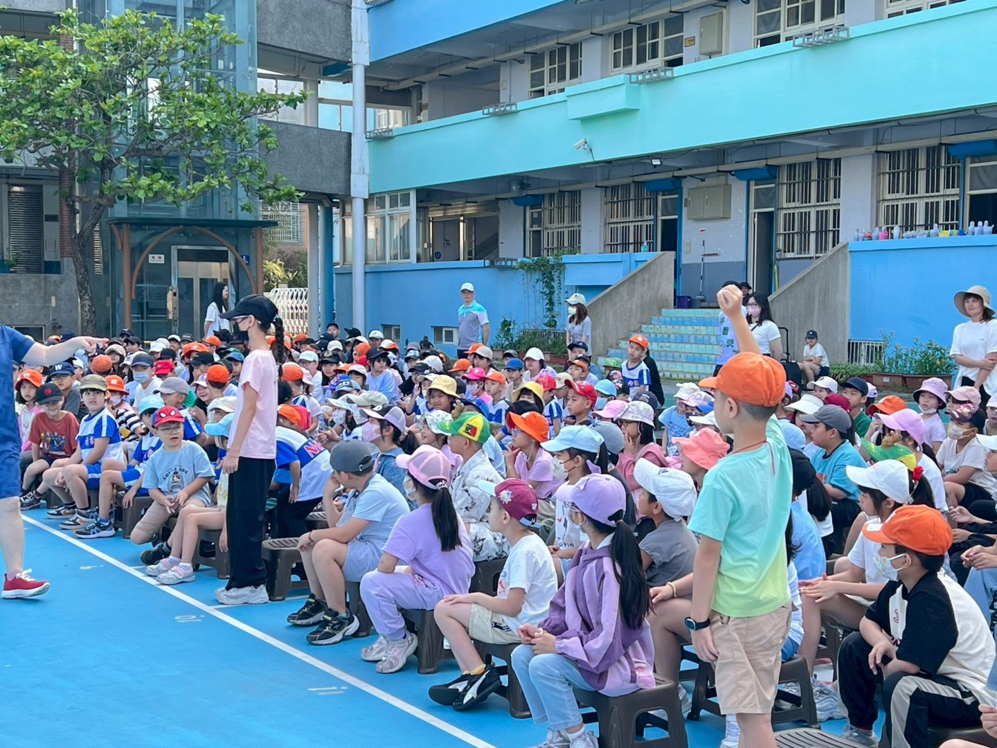 今天又是一個月一次的學生實體朝會,大家都戴著帽子和小椅子在操場集合,學生服務隊忙著安排擴音系統,還有複習典禮的英語指令。