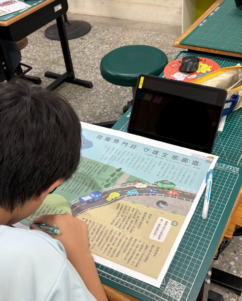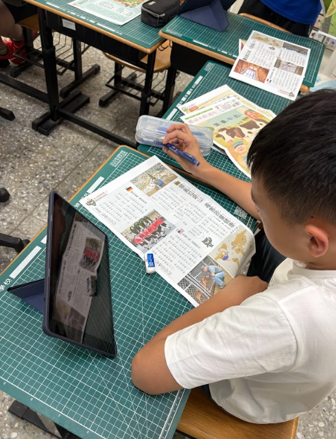 語文課堂中,為響應世界地球日,文章圍繞著「環境保育」、「環保」等全球議題。(取自國語日報文章)學生們先自選有興趣的環境相關文本,閱讀文章後,再針對長文內容進行摘要。除了訓練學生的語文能力,也提升孩子對於國內外環境議題的認識。