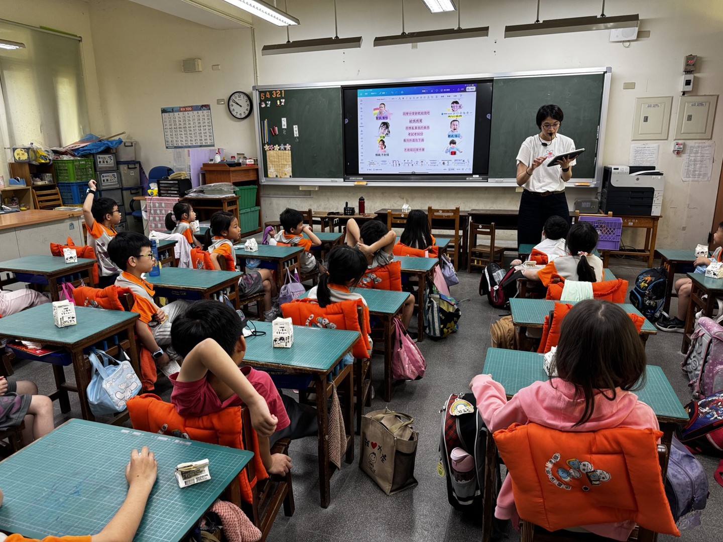 輔導老師入班進行情緒教育宣導時,透過有系統的教學流程,引導學生逐步認識與理解情緒。首先,以簡單易懂的說明讓學生知道「每個人都有情緒,且情緒沒有好壞之分」,建立正確觀念,接著介紹開心、生氣、難過、害怕等基本情緒,協助學生進行情緒辨識。過程中結合提問與生活情境,引導學生分享自身經驗,增進情緒覺察能力。