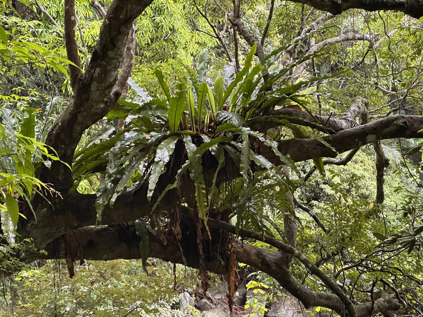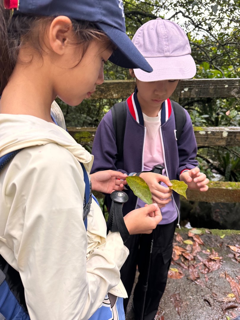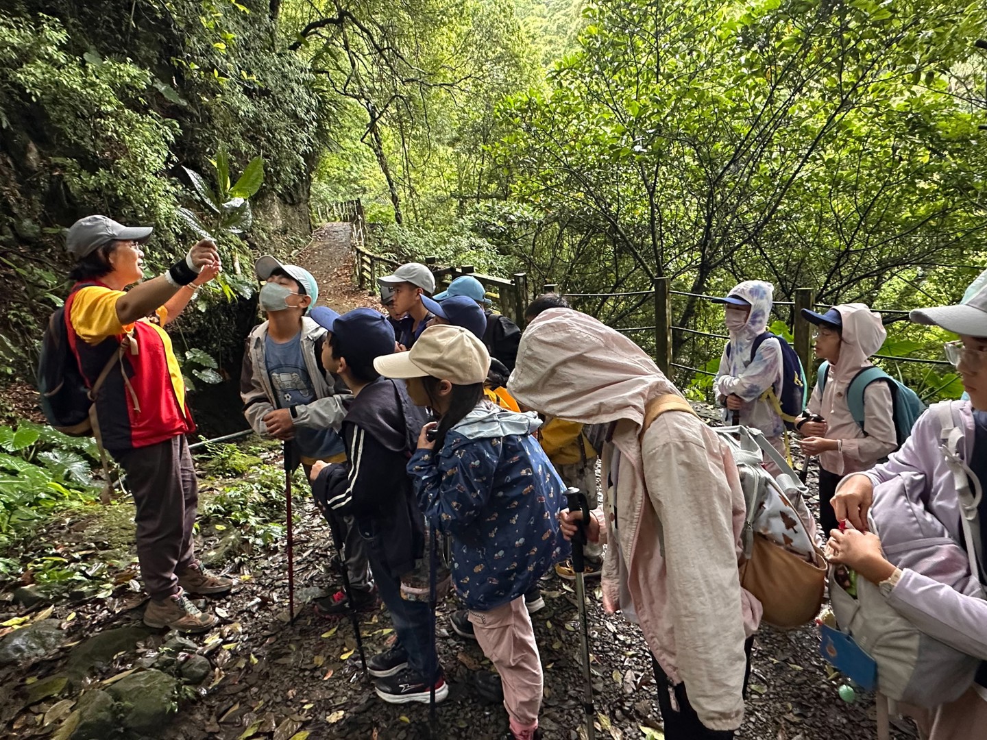 春季馬胎古道的氣候較為潮濕,淑娟主任和振義老師沿途介紹許多當地的特色植物,從是否可以食用這個角度切入最為實際了,例如鳥巢蕨,它的嫩芽就是我們食用的山蘇;冷清草和樓梯草長的很像,但一種可以吃另一種不能吃;還有豆豆龍當成雨傘的姑婆芋,葉子長的很像水芋,但前者卻是有毒植物。