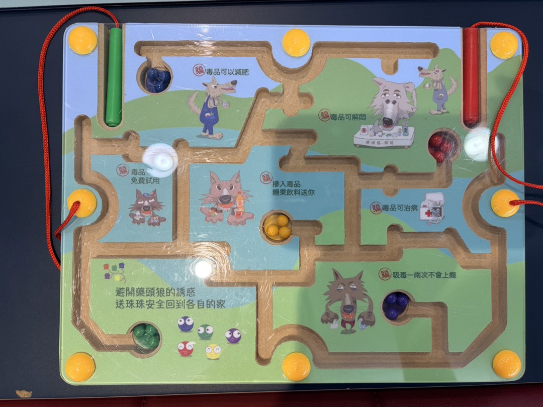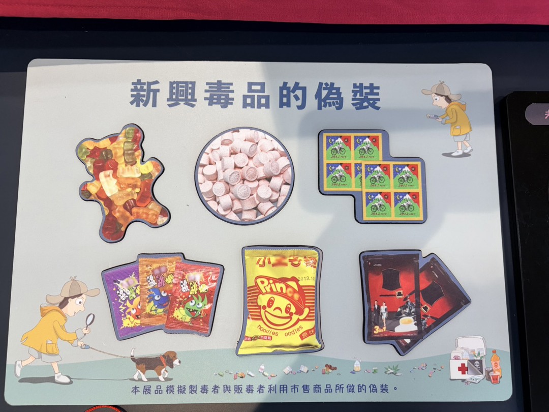 本次展覽以「寓教於樂」為核心,特別規劃防毒主題教具展示,內容包含毒品辨識、情境模擬及互動遊戲,讓學生在操作與體驗中學習反毒知識與重要性。透過活潑有趣的方式,打破傳統宣導的單向講述,使學生能更主動參與,進一步了解新興毒品偽裝樣態及可能帶來的法律責任與健康危害。