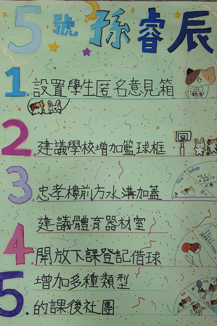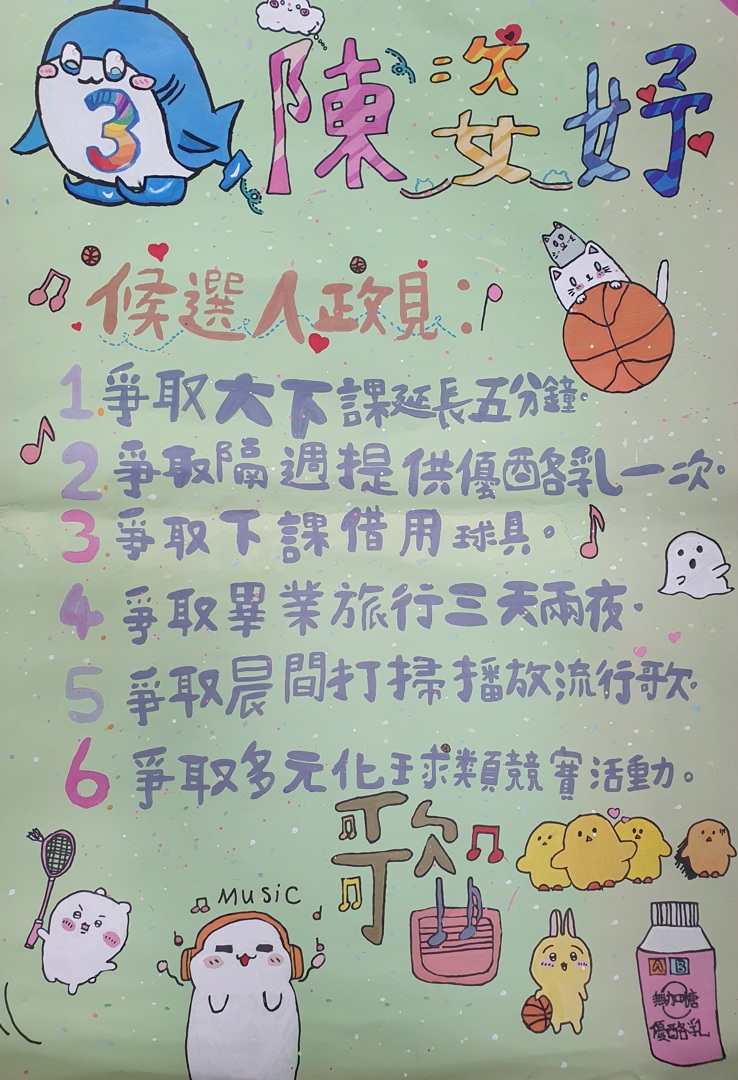 此外,校園內亦完成各候選人用心準備競選海報的布置,各具巧思的設計吸引師生駐足欣賞。色彩繽紛的海報不僅展現候選人的個人風格,也讓校園空間增添活潑氣息,營造出濃厚的選舉氛圍。