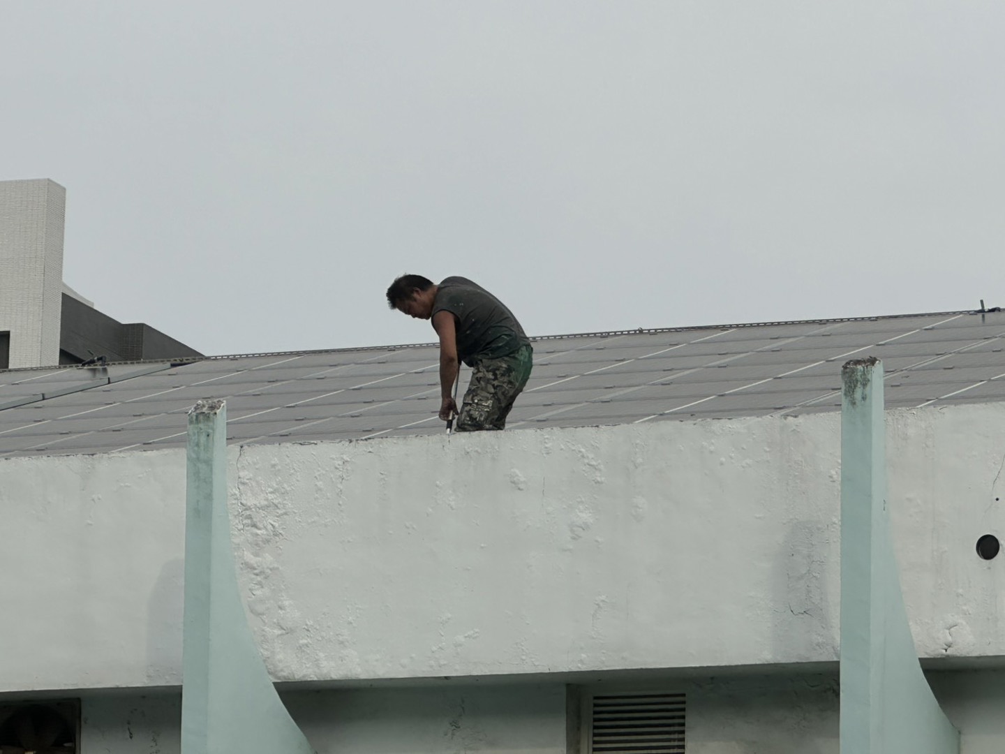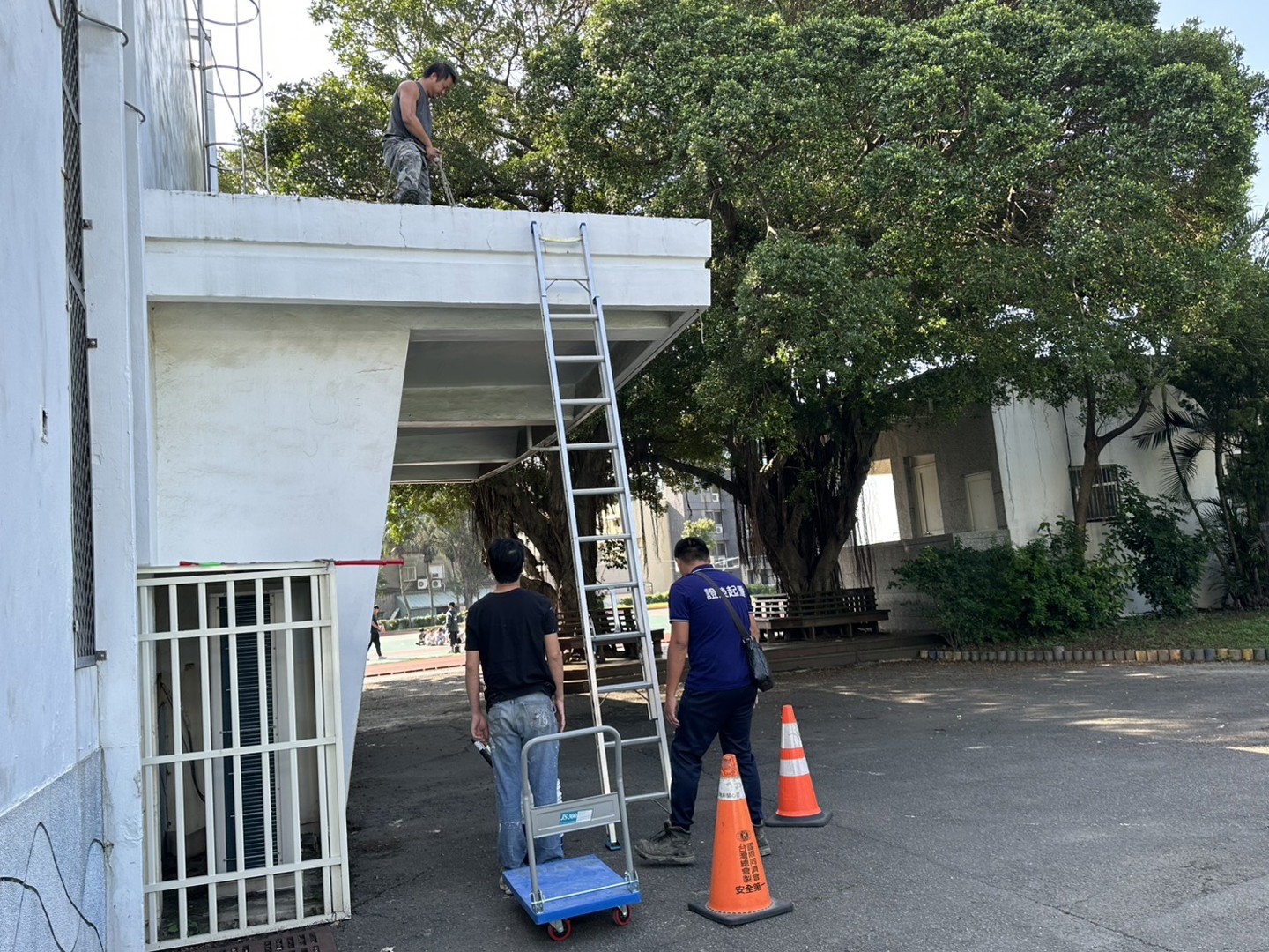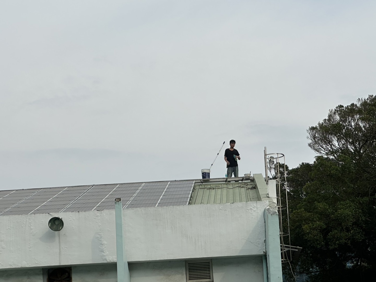 家長會黃會長燕暉得知學校困境後,立刻到校實地勘查,同時號召彭副會長證榮及南寮校友等,替南寮禮堂量身訂做防水計畫。為了利用陽光普照的時間施作,會長、副會長犧牲許多假日時光,率領多人頂著豔陽、連續趕工,終於在昨天(28)完成禮堂頂樓防水漆!困擾學校多時的禮堂漏水問題終於獲得解決!