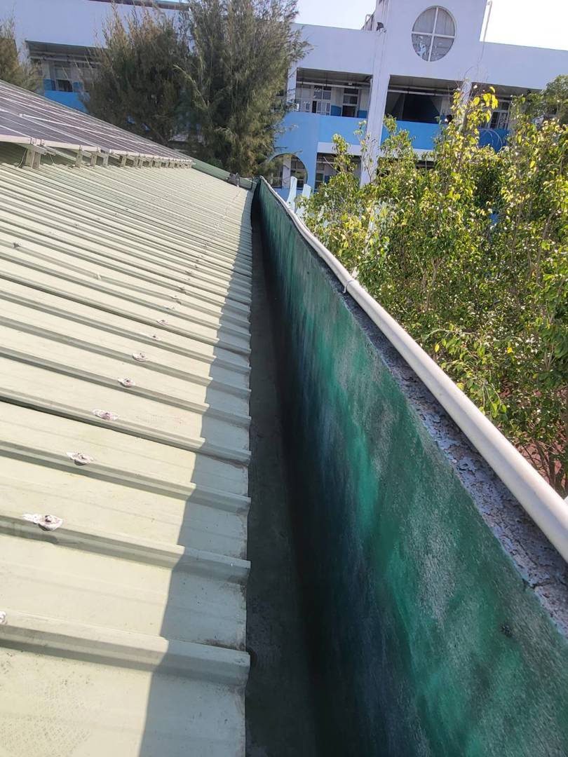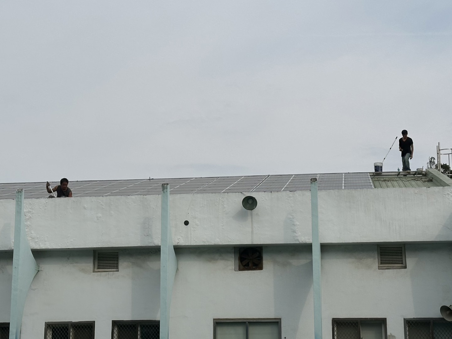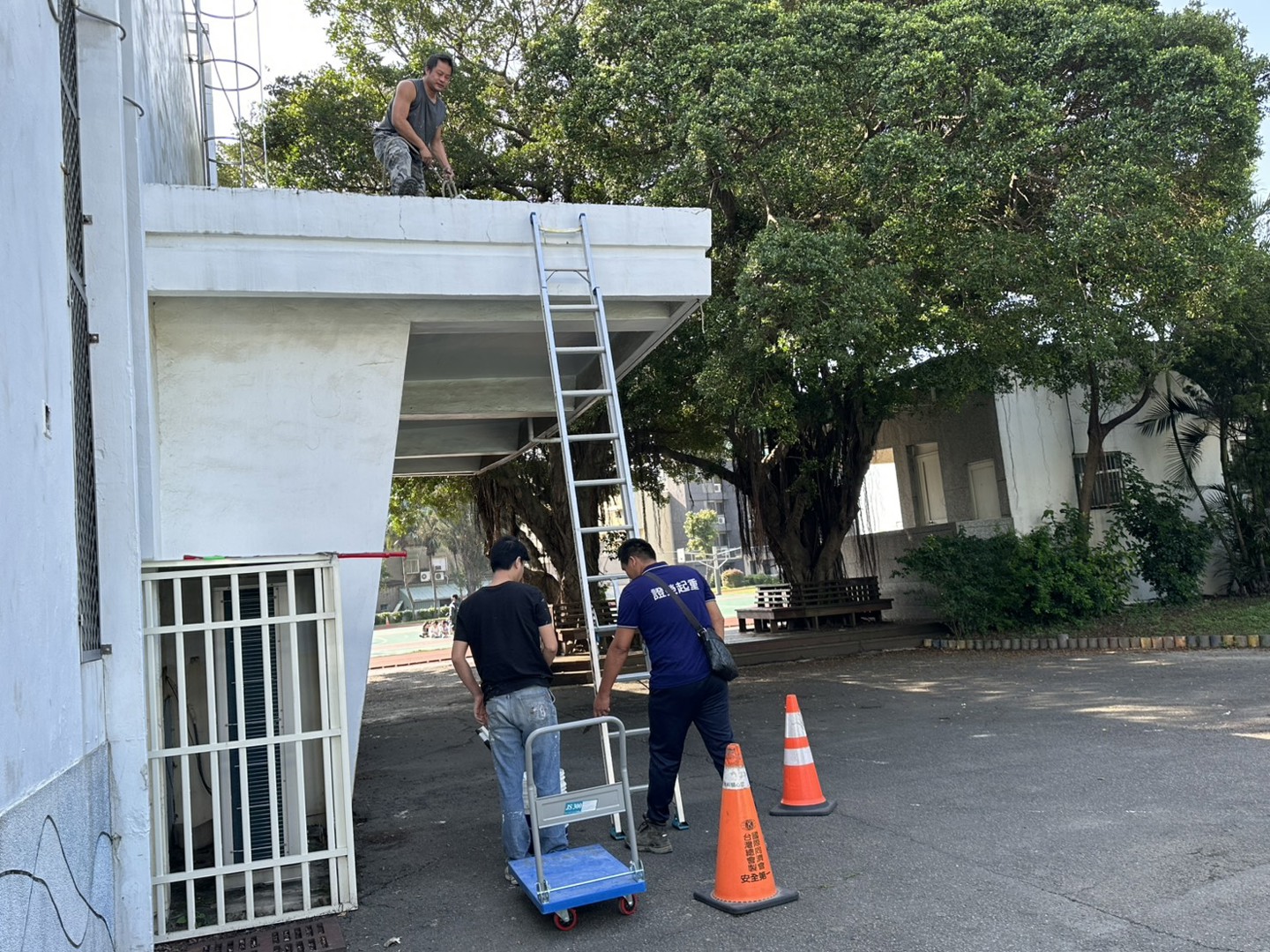 家長會黃會長燕暉得知學校困境後,立刻到校實地勘查,同時號召彭副會長證榮及南寮校友等,替南寮禮堂量身訂做防水計畫。為了利用陽光普照的時間施作,會長、副會長犧牲許多假日時光,率領多人頂著豔陽、連續趕工,終於在昨天(28)完成禮堂頂樓防水漆!困擾學校多時的禮堂漏水問題終於獲得解決!