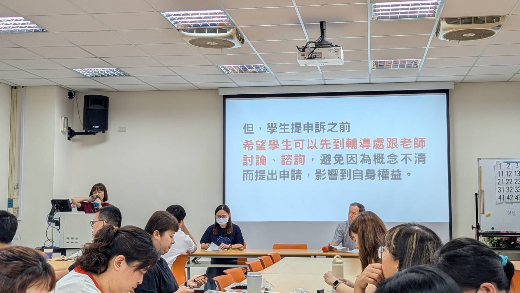 為了營造友善校園,提升學生自主管理與自我權益保護意識,近日於全校朝會和全校教師議案宣導時間,向全校師生宣導學生申訴制度。宣導中說明制度宗旨,在於保障學生受教權及表達意見的權利,當學生認為自身權益受影響時,可以透過合法程序與學校溝通並提出申訴。目的是希望建立理性溝通的管道,面對並解決問題。