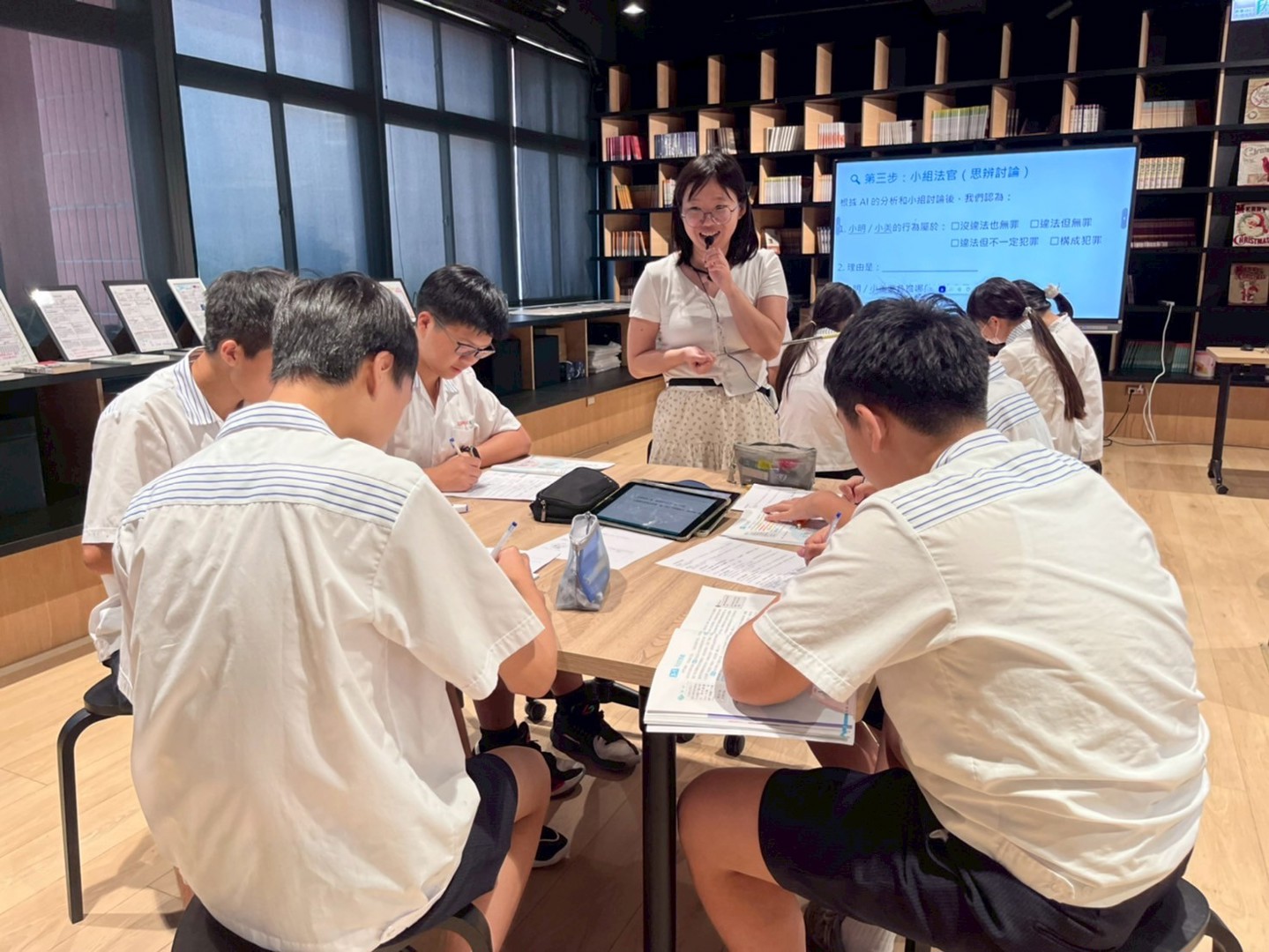 課程跳脫傳統公民課模式,宜蓁老師採用「問題導向學習」(PBL),將教室瞬間轉化為犯罪調查現場。課程初期,老師引導學生運用平板載具,對生成式AI(Gemini)下達精準的提示詞(Prompt),將艱澀的法律文字轉化為白話的案例解析。