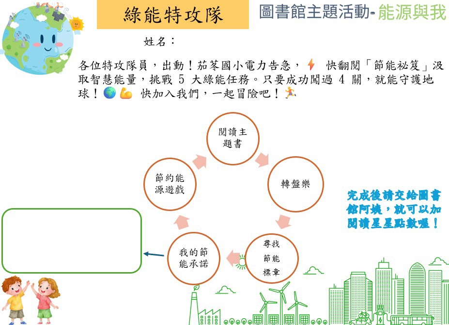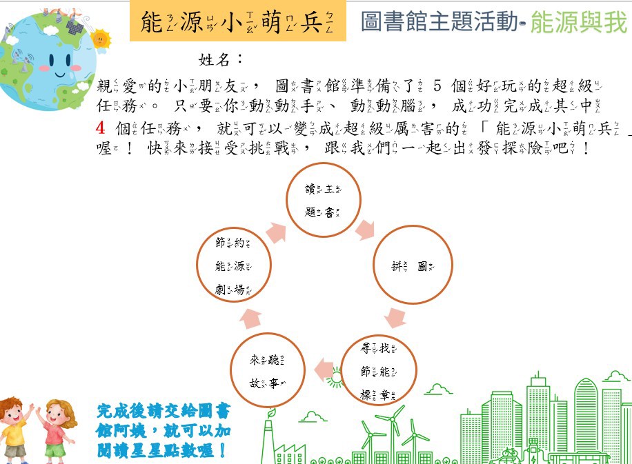 圖書館為大小朋友準備了 5 個好玩的超級任務,只要你動動手、動動腦,成功完成其中 4 個任務,就可以變成超級厲害的「能源小萌兵」喔!快來接受挑戰,跟我們一起出發探險吧!
